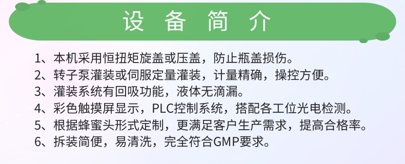 自动封口:在灌装完成后,自动完成瓶盖的密封,保证产品在运输和储存过程中的卫生与安全。